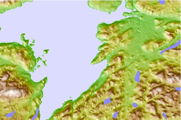 Use this relief map to navigate to tide stations, surf breaks and cities that are in the area of Sandwich Bay (East Arm), Newfoundland.