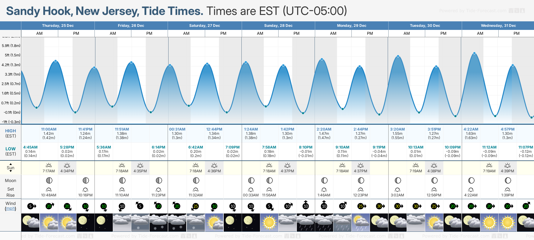December and January Tide charts for Sandy Hook: The tide charts below show the height, time and date of high and low tides for the next 30 days.