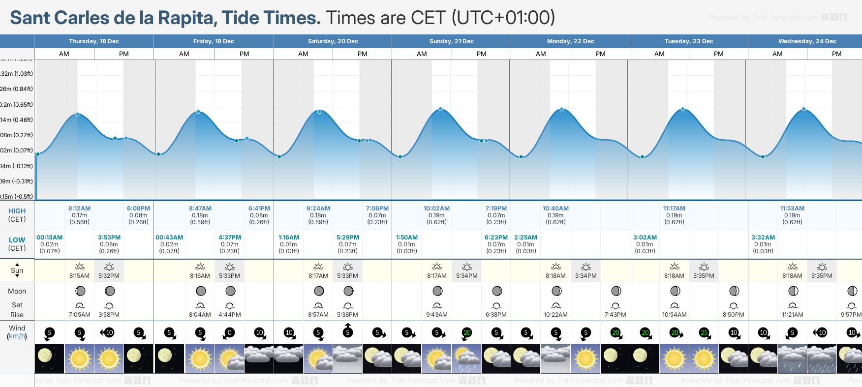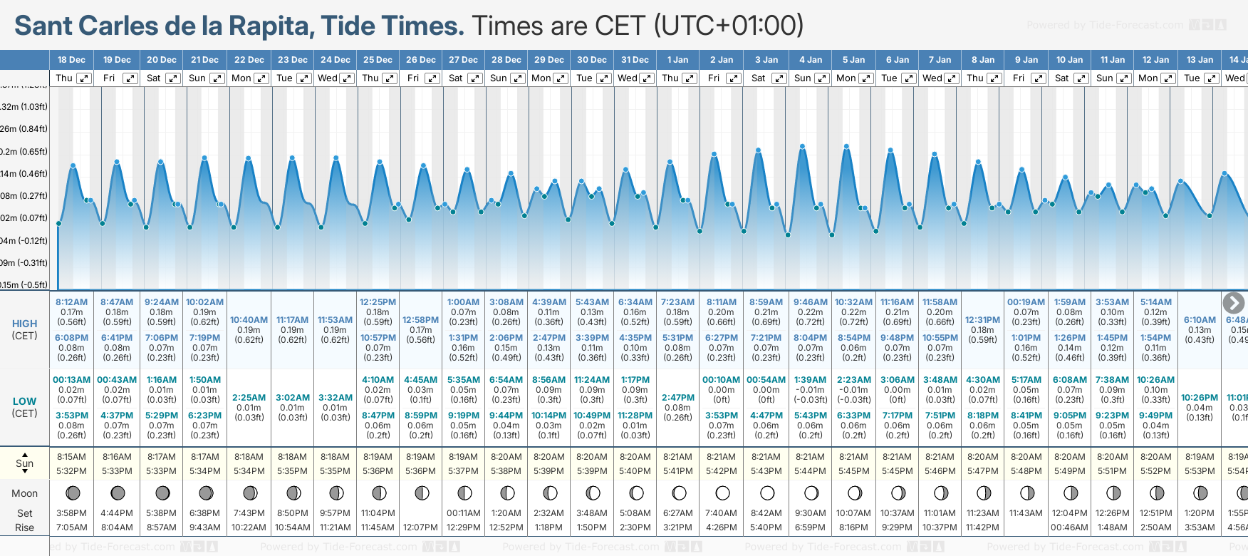Tide Times are CET (UTC +1.0hrs). Last Spring High Tide at Sant Carles de la Rapita was on Sun 07 Dec (height: 0.22m 0.7ft). Next high Spring Tide at Sant Carles de la Rapita will be on Sun 21 Dec (height: 0.19m 0.6ft).