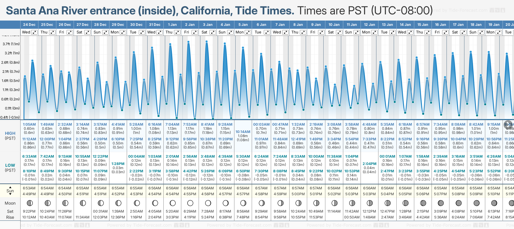 Tide Times are PST (UTC -8.0hrs). Last Spring High Tide at Santa Ana River entrance (inside) was on Sun 21 Dec (height: 0.99m 3.2ft). Next high Spring Tide at Santa Ana River entrance (inside) will be on Sat 03 Jan (height: 1.18m 3.9ft).