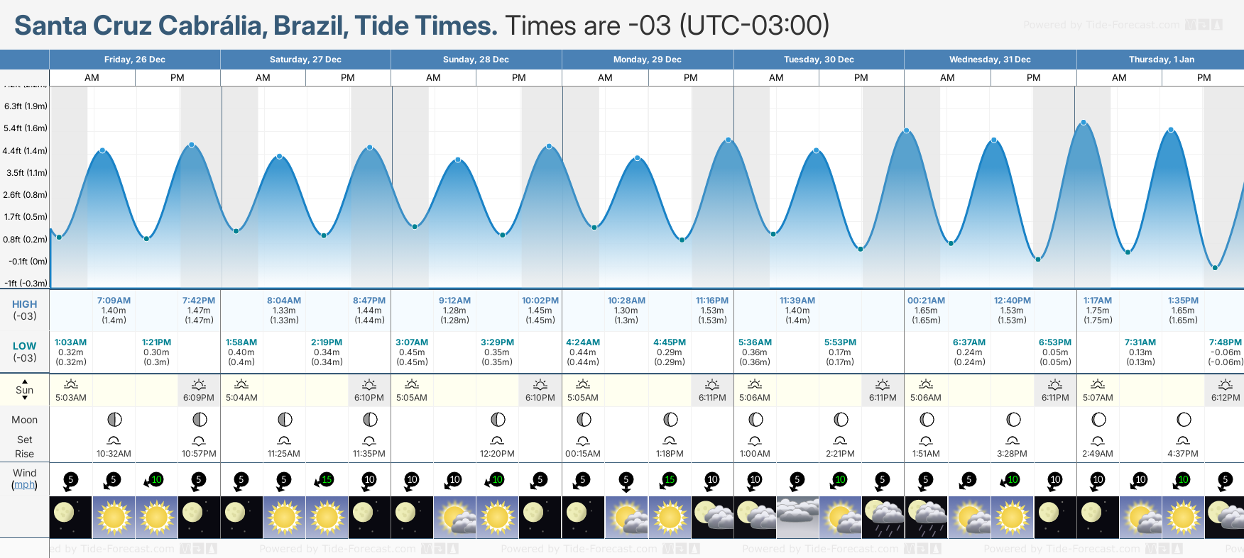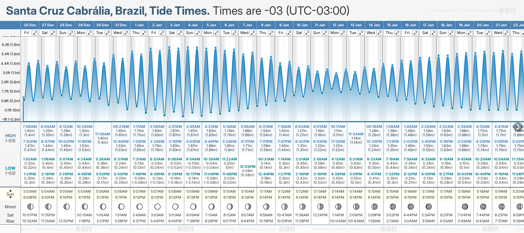 December and January Tide charts for Santa Cruz Cabralia: The tide charts below show the height, time and date of high and low tides for the next 30 days.