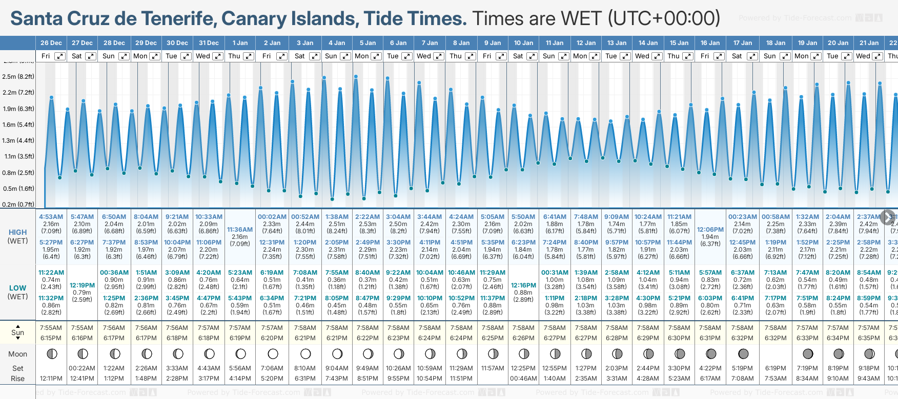 Tide Times are WET (UTC +0hrs). Last Spring High Tide at Santa Cruz de Tenerife was on Mon 22 Dec (height: 2.29m 7.5ft). Next high Spring Tide at Santa Cruz de Tenerife will be on Mon 05 Jan (height: 2.53m 8.3ft).