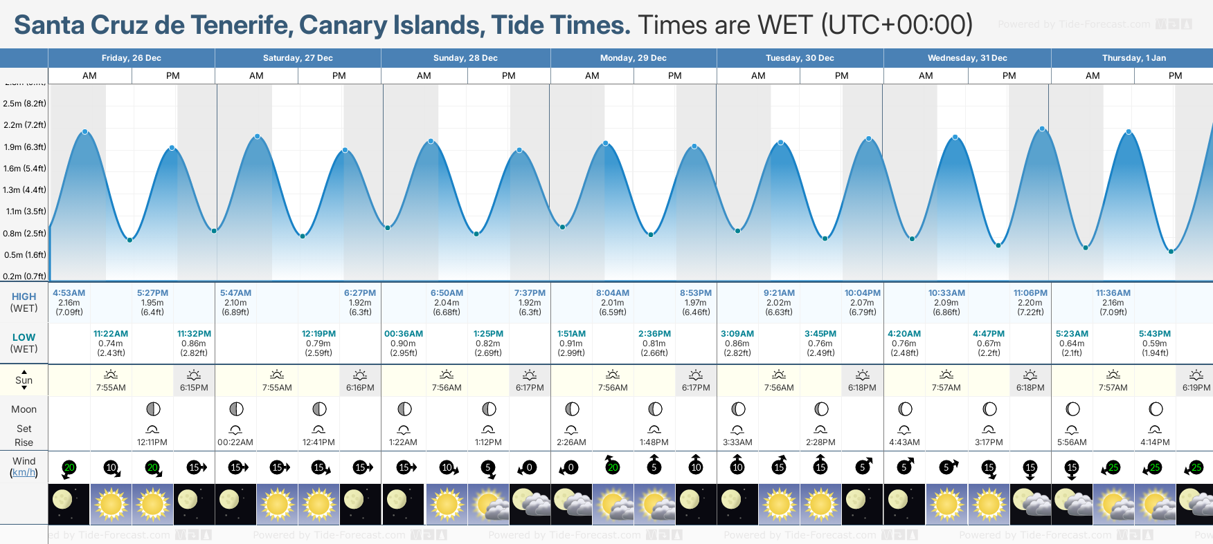 Tide chart for Santa Cruz de TenerifeShowing low and high tide times for the next 30 days at Santa Cruz de Tenerife. Tide Times are WET (UTC +0hrs).