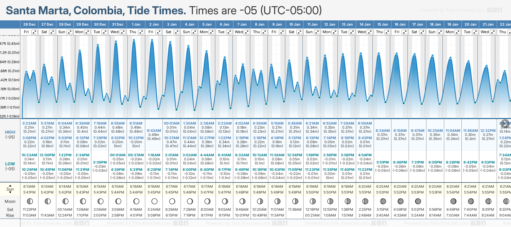 December and January Tide charts for Santa Marta: The tide charts below show the height, time and date of high and low tides for the next 30 days.