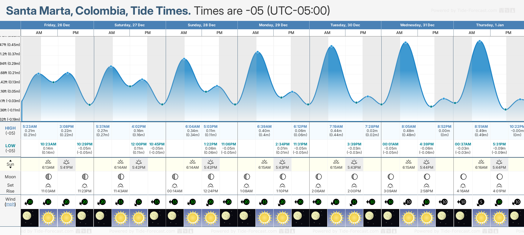 Tide chart for Santa MartaShowing low and high tide times for the next 30 days at Santa Marta. Tide Times are -05 (UTC -5.0hrs).