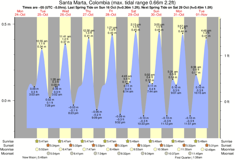 Tide Times are -05 (UTC -5.0hrs). Last Spring High Tide at Santa Marta was on Fri 19 Dec (height: 0.38m 1.2ft). Next high Spring Tide at Santa Marta will be on Thu 01 Jan (height: 0.49m 1.6ft).