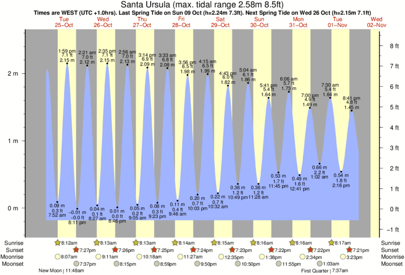 Tide chart for Santa UrsulaShowing low and high tide times for the next 30 days at Santa Ursula. Tide Times are WET (UTC +0hrs).