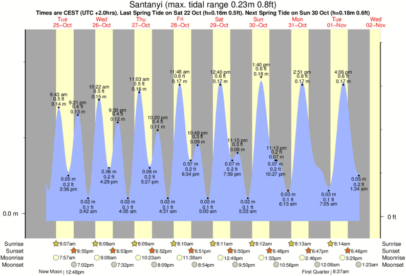 Tide Times are CET (UTC +1.0hrs). Last Spring High Tide at Santanyi was on Fri 19 Dec (height: 0.18m 0.6ft). Next high Spring Tide at Santanyi will be on Sat 03 Jan (height: 0.21m 0.7ft).