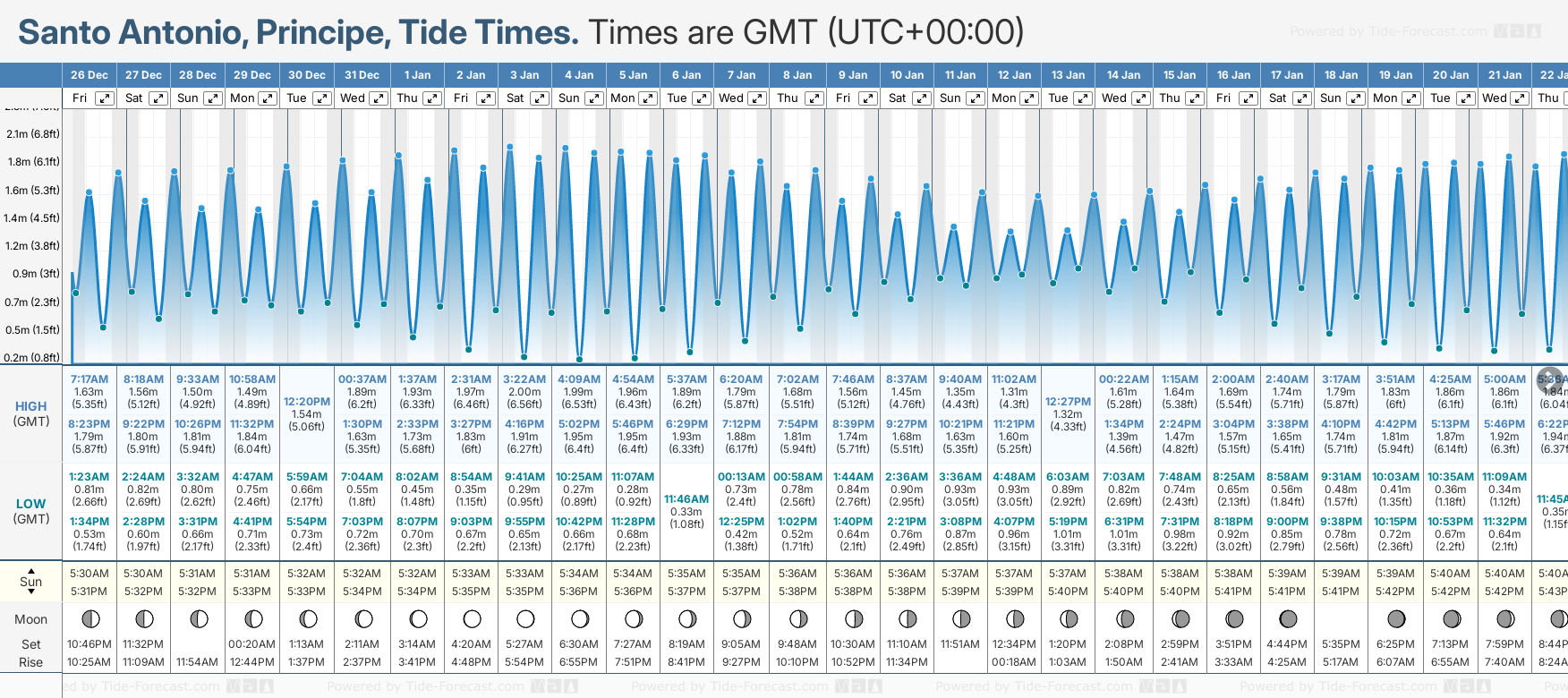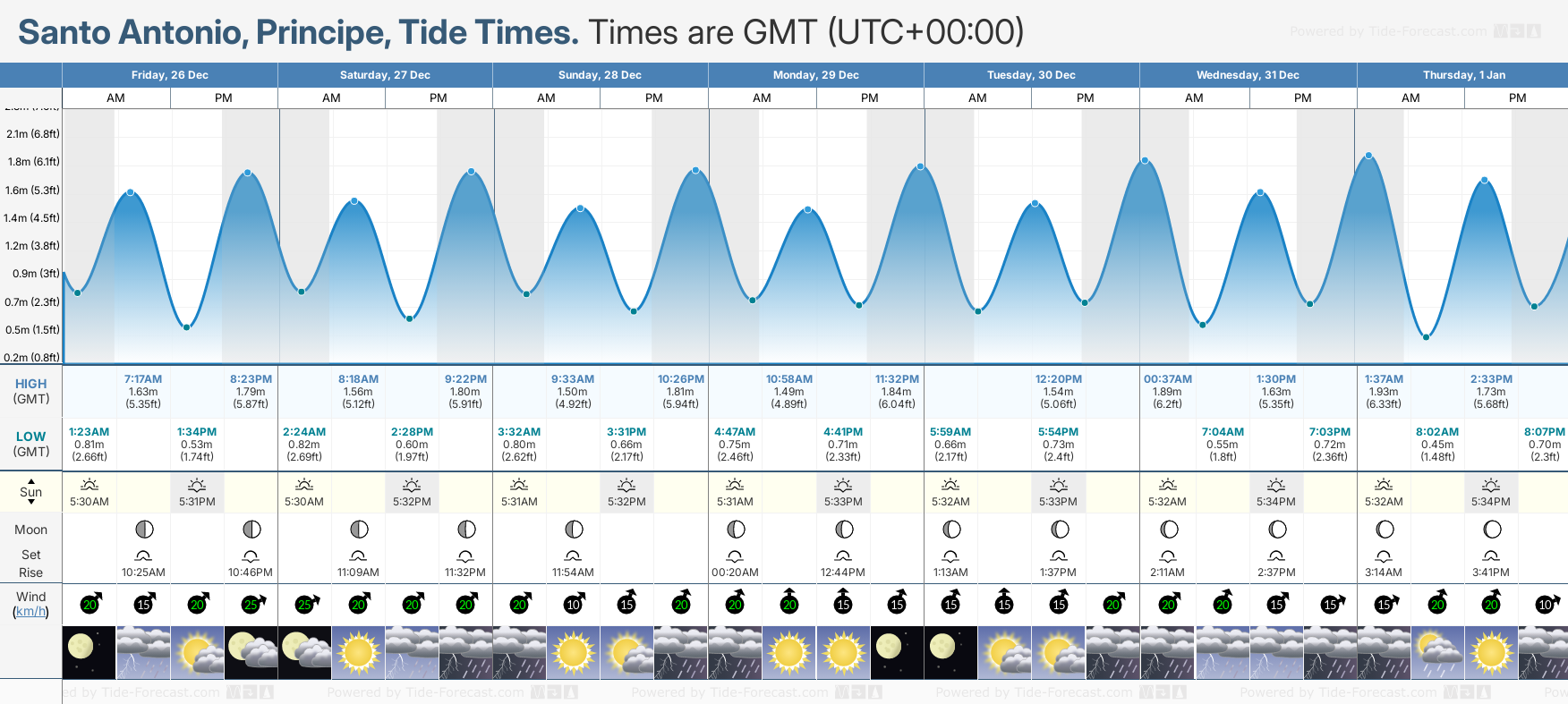 Tide Times are GMT (UTC +0hrs). Last Spring High Tide at Santo Antonio, Principe was on Mon 22 Dec (height: 1.82m 6.0ft). Next high Spring Tide at Santo Antonio, Principe will be on Sat 03 Jan (height: 2.00m 6.6ft).