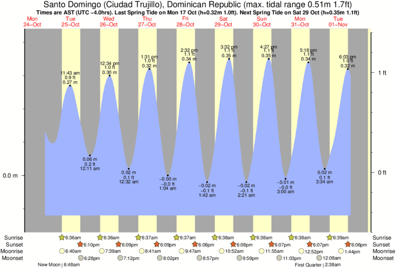 Tide Times are AST (UTC -4.0hrs). Last Spring High Tide at Santo Domingo (Ciudad Trujillo) was on Wed 17 Dec (height: 0.30m 1.0ft). Next high Spring Tide at Santo Domingo (Ciudad Trujillo) will be on Fri 02 Jan (height: 0.35m 1.1ft).