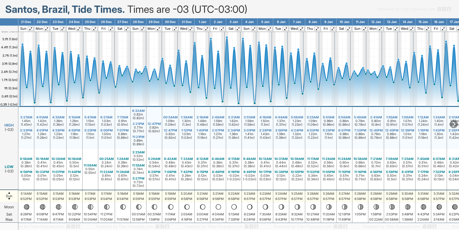 December and January Tide charts for Santos: The tide charts below show the height, time and date of high and low tides for the next 30 days.