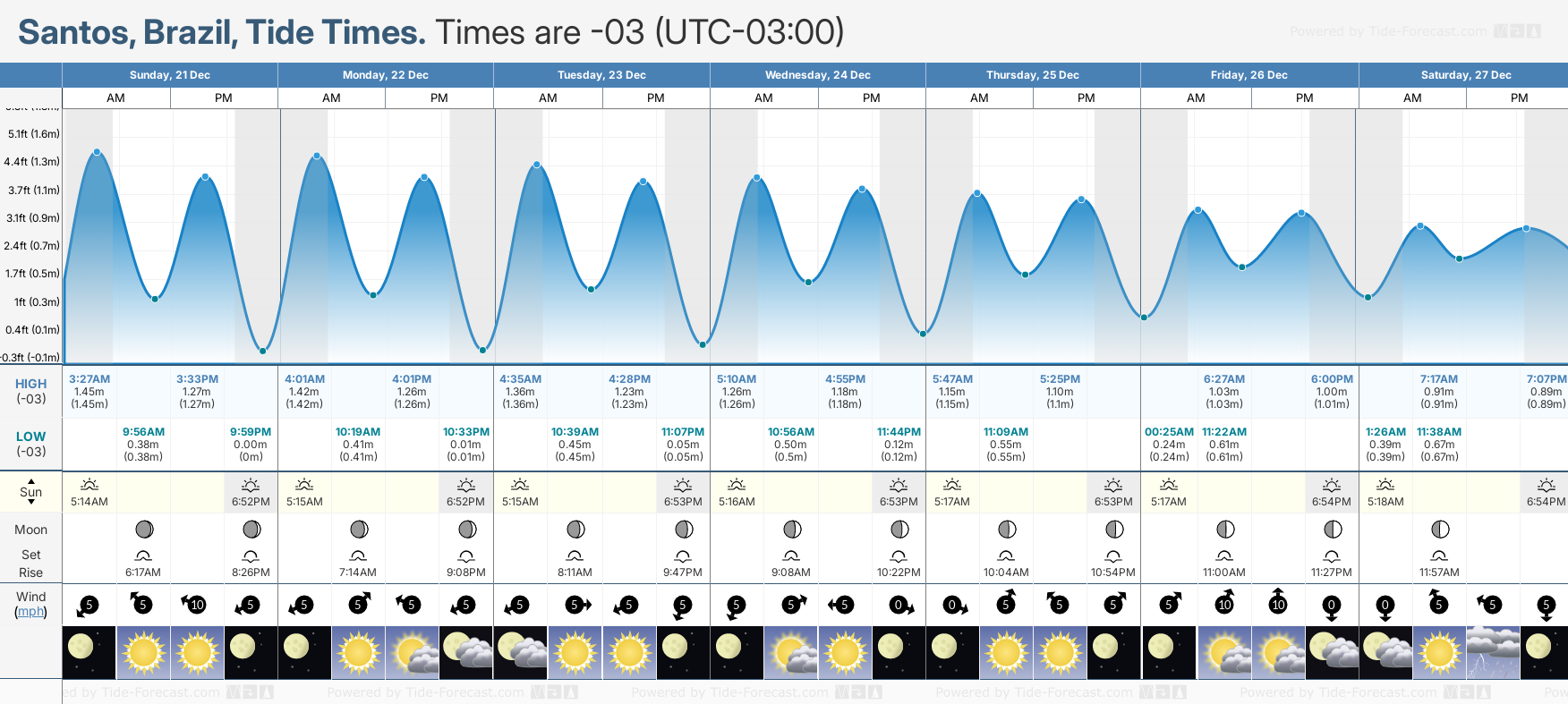 Tide chart for SantosShowing low and high tide times for the next 30 days at Santos. Tide Times are -03 (UTC -3.0hrs).