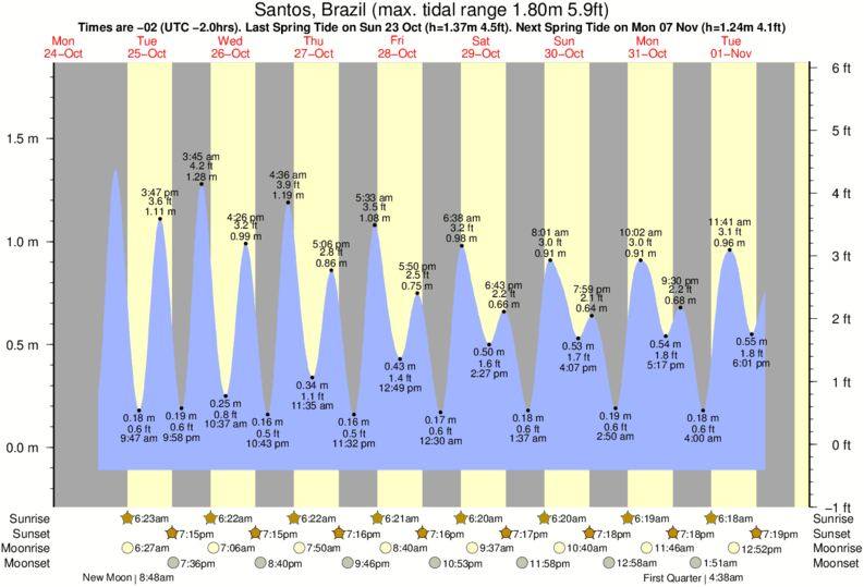 Tide Times are -03 (UTC -3.0hrs). Last Spring High Tide at Santos was on Fri 05 Dec (height: 1.44m 4.7ft). Next high Spring Tide at Santos will be on Sun 21 Dec (height: 1.45m 4.8ft).