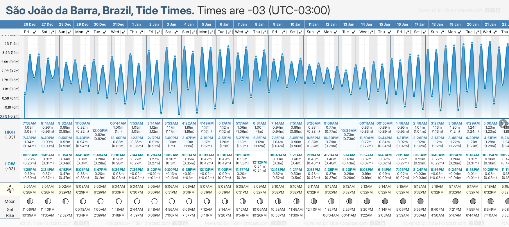 December and January Tide charts for Sao Joao da Barra: The tide charts below show the height, time and date of high and low tides for the next 30 days.