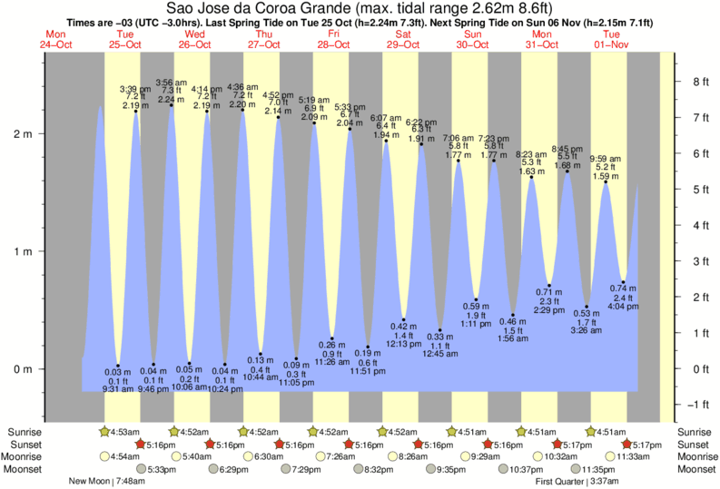 Tide Times are -03 (UTC -3.0hrs). Last Spring High Tide at Sao Jose da Coroa Grande was on Fri 05 Dec (height: 2.22m 7.3ft). Next high Spring Tide at Sao Jose da Coroa Grande will be on Mon 22 Dec (height: 1.99m 6.5ft).