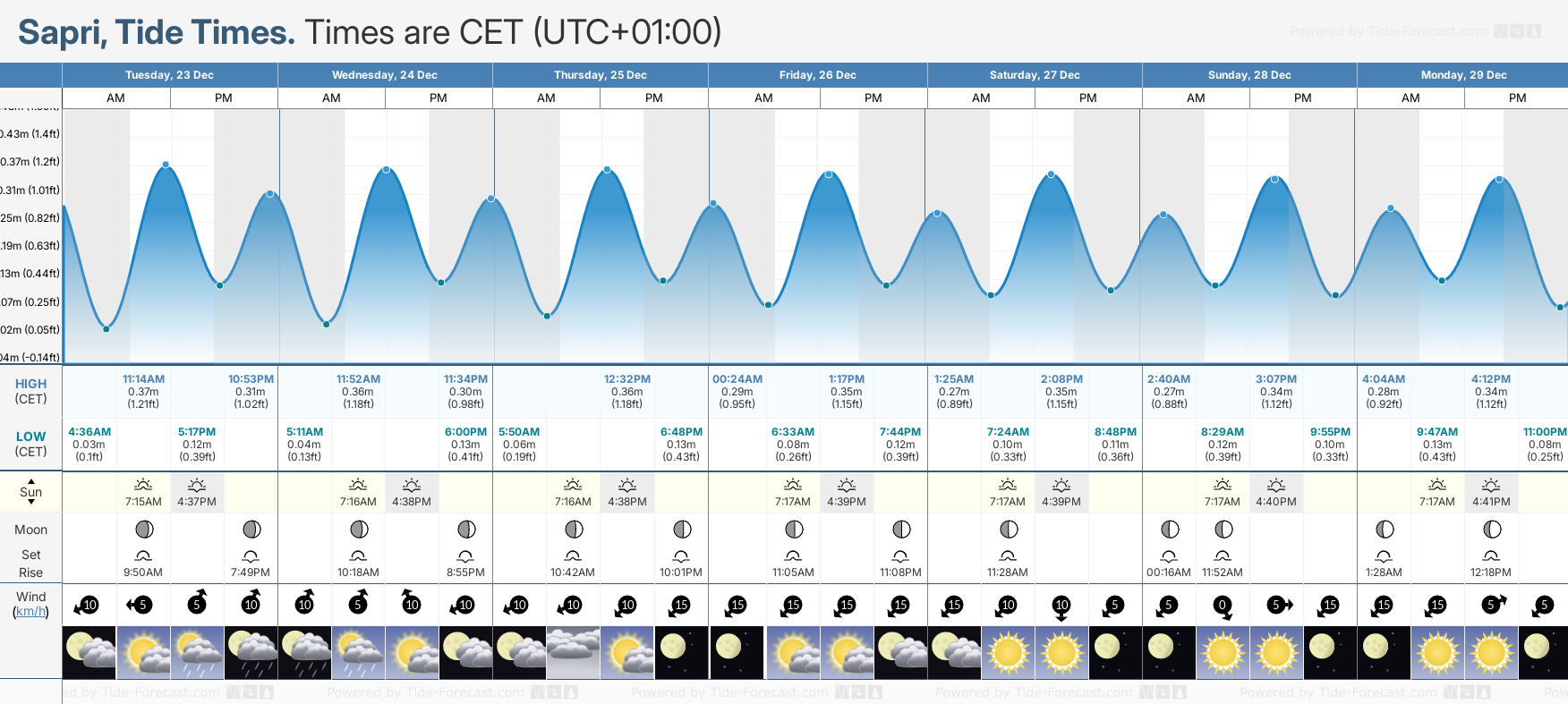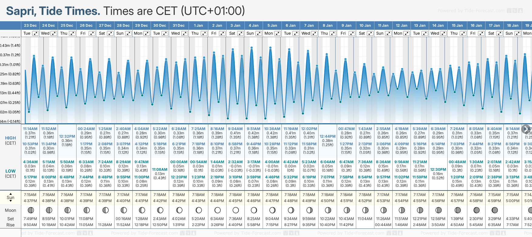 Tide Times are CET (UTC +1.0hrs). Last Spring High Tide at Sapri was on Mon 22 Dec (height: 0.37m 1.2ft). Next high Spring Tide at Sapri will be on Sun 04 Jan (height: 0.42m 1.4ft).