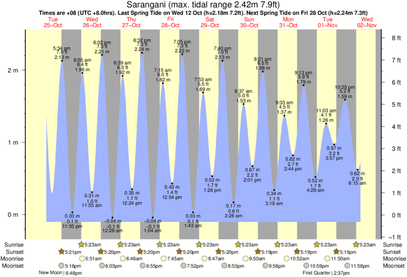 Tide Times are PST (UTC +8.0hrs). Last Spring High Tide at Sarangani was on Sun 07 Dec (height: 2.32m 7.6ft). Next high Spring Tide at Sarangani will be on Mon 22 Dec (height: 2.06m 6.8ft).