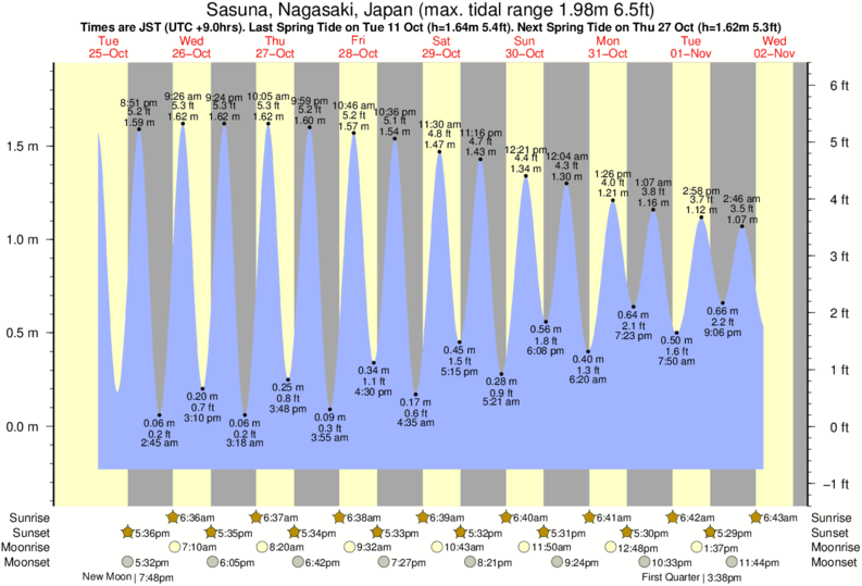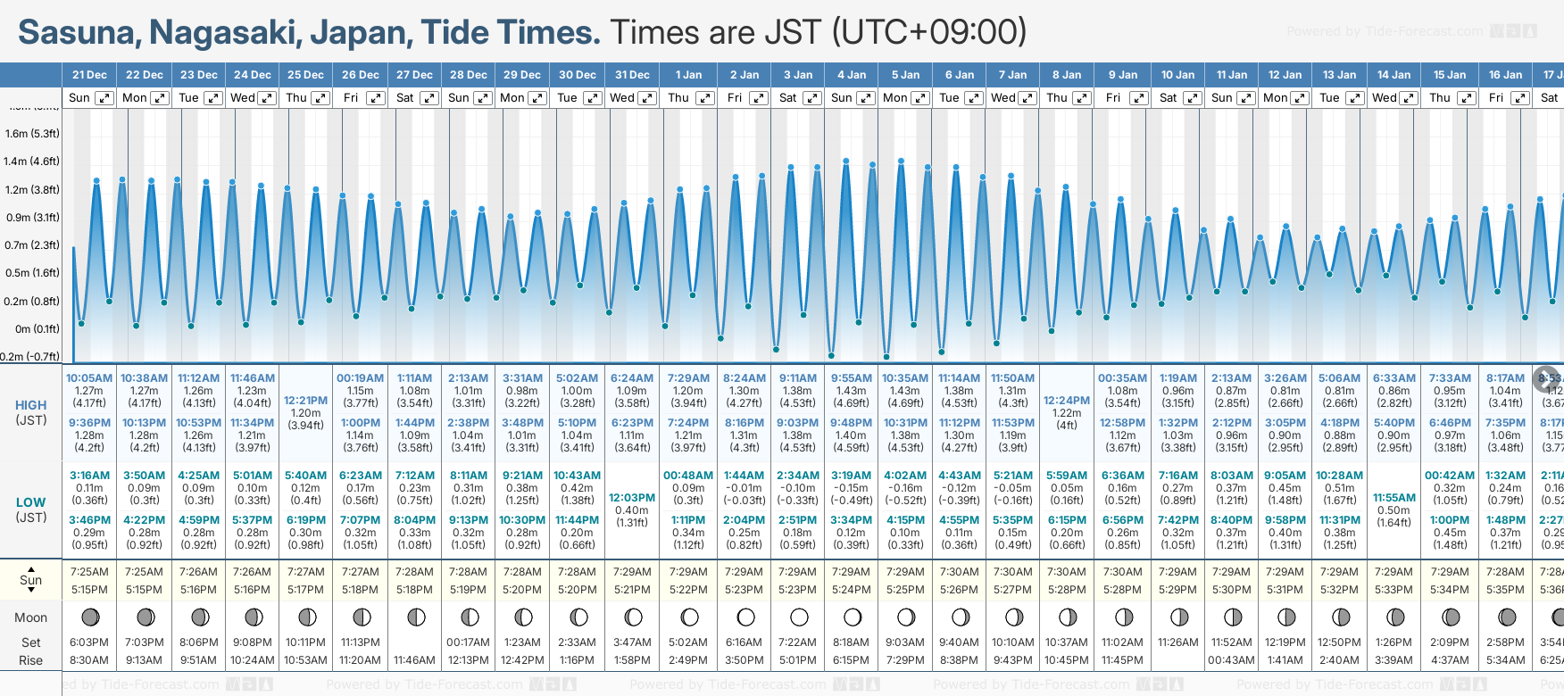 Tide Times are JST (UTC +9.0hrs). Last Spring High Tide at Sasuna was on Sat 06 Dec (height: 1.53m 5.0ft). Next high Spring Tide at Sasuna will be on Mon 22 Dec (height: 1.28m 4.2ft).