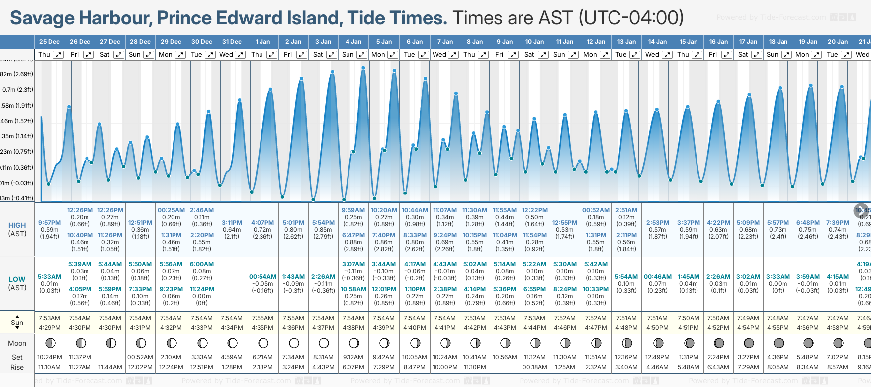 December and January Tide charts for Savage Harbour: The tide charts below show the height, time and date of high and low tides for the next 30 days.