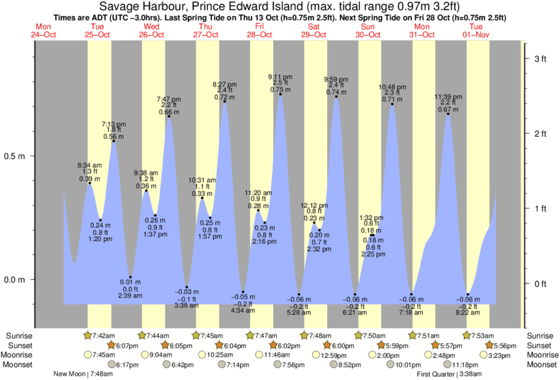 Tide Times are AST (UTC -4.0hrs). Last Spring High Tide at Savage Harbour was on Sun 07 Dec (height: 0.89m 2.9ft). Next high Spring Tide at Savage Harbour will be on Mon 22 Dec (height: 0.77m 2.5ft).