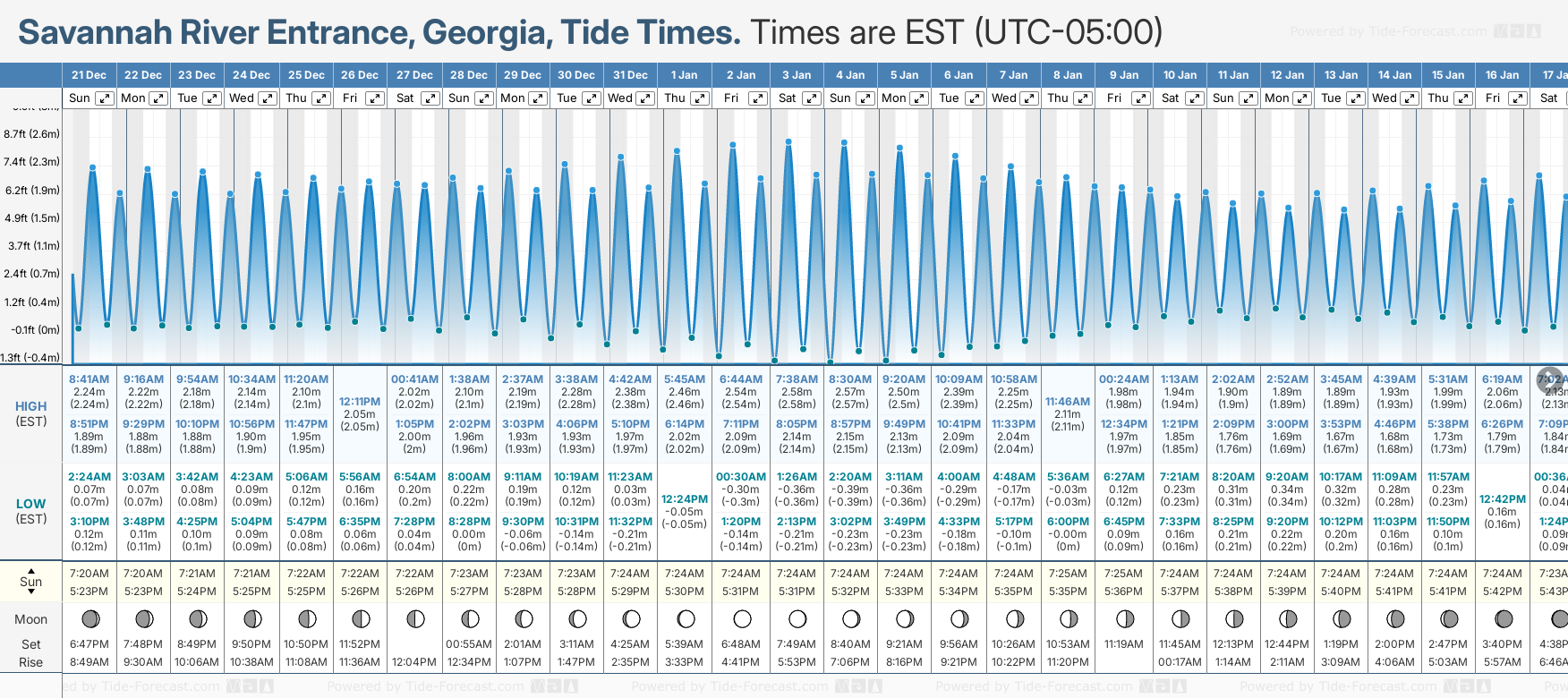 Tide chart for Savannah River EntranceShowing low and high tide times for the next 30 days at Savannah River Entrance. Tide Times are EST (UTC -5.0hrs).
