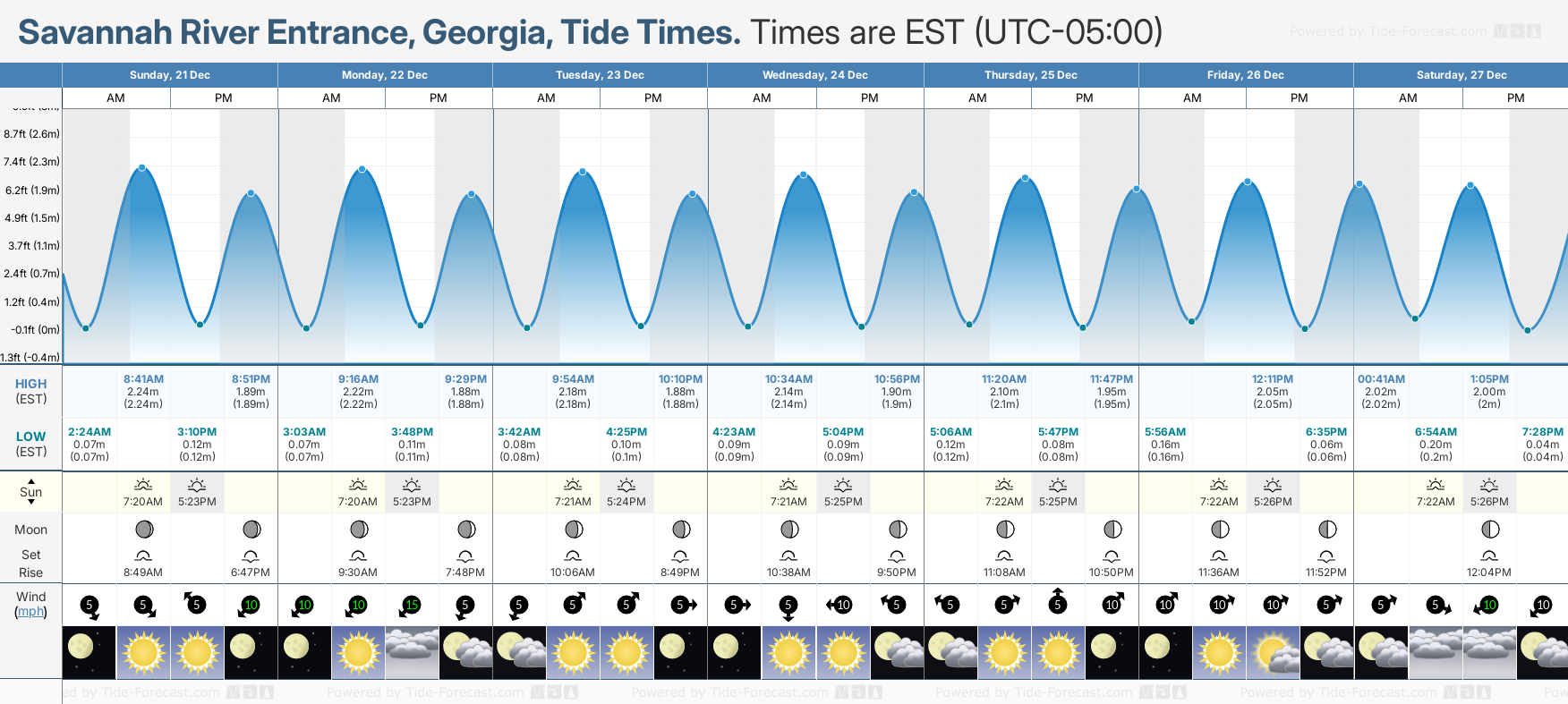 Tide Times are EST (UTC -5.0hrs). Last Spring High Tide at Savannah River Entrance was on Fri 05 Dec (height: 2.76m 9.1ft). Next high Spring Tide at Savannah River Entrance will be on Sun 21 Dec (height: 2.24m 7.3ft).