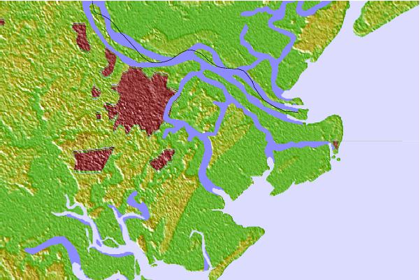 Use this relief map to navigate to tide stations, surf breaks and cities that are in the area of Savannah Sheraton Resort Hotel, Wilmington River, Georgia.