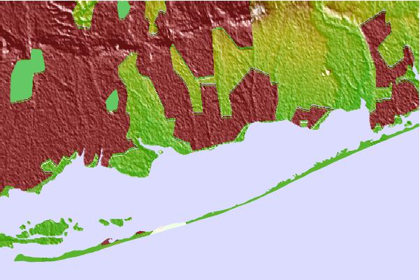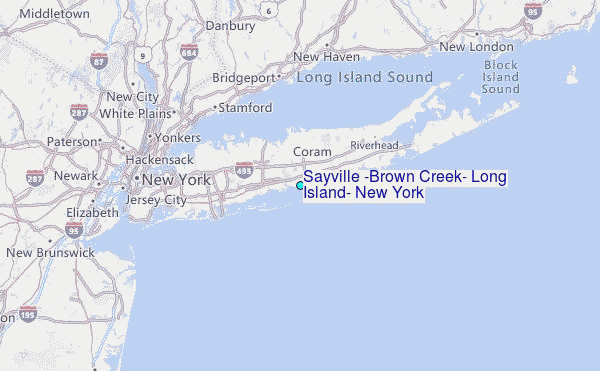 Use this relief map to navigate to tide stations, surf breaks and cities that are in the area of Sayville (Brown Creek), Long Island, New York.