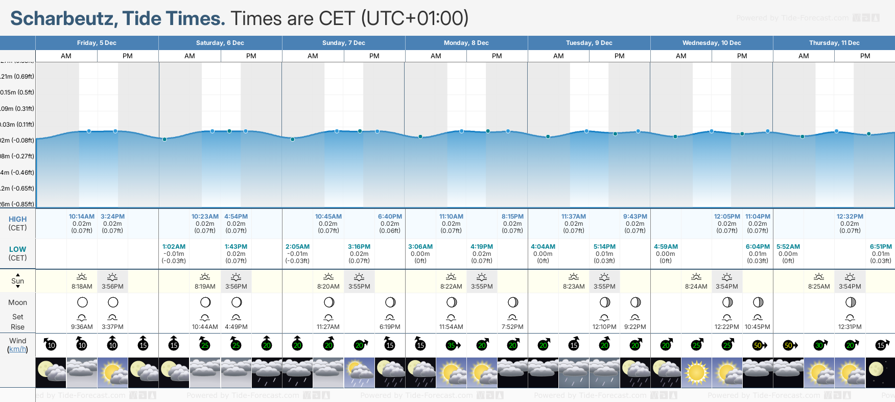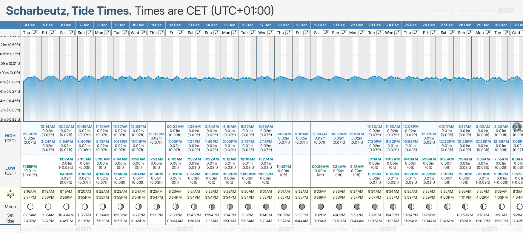 Tide Times are CET (UTC +1.0hrs). Last Spring High Tide at Scharbeutz was on Mon 01 Dec (height: 0.01m 0.0ft). Next high Spring Tide at Scharbeutz will be on Sat 06 Dec (height: 0.02m 0.1ft).