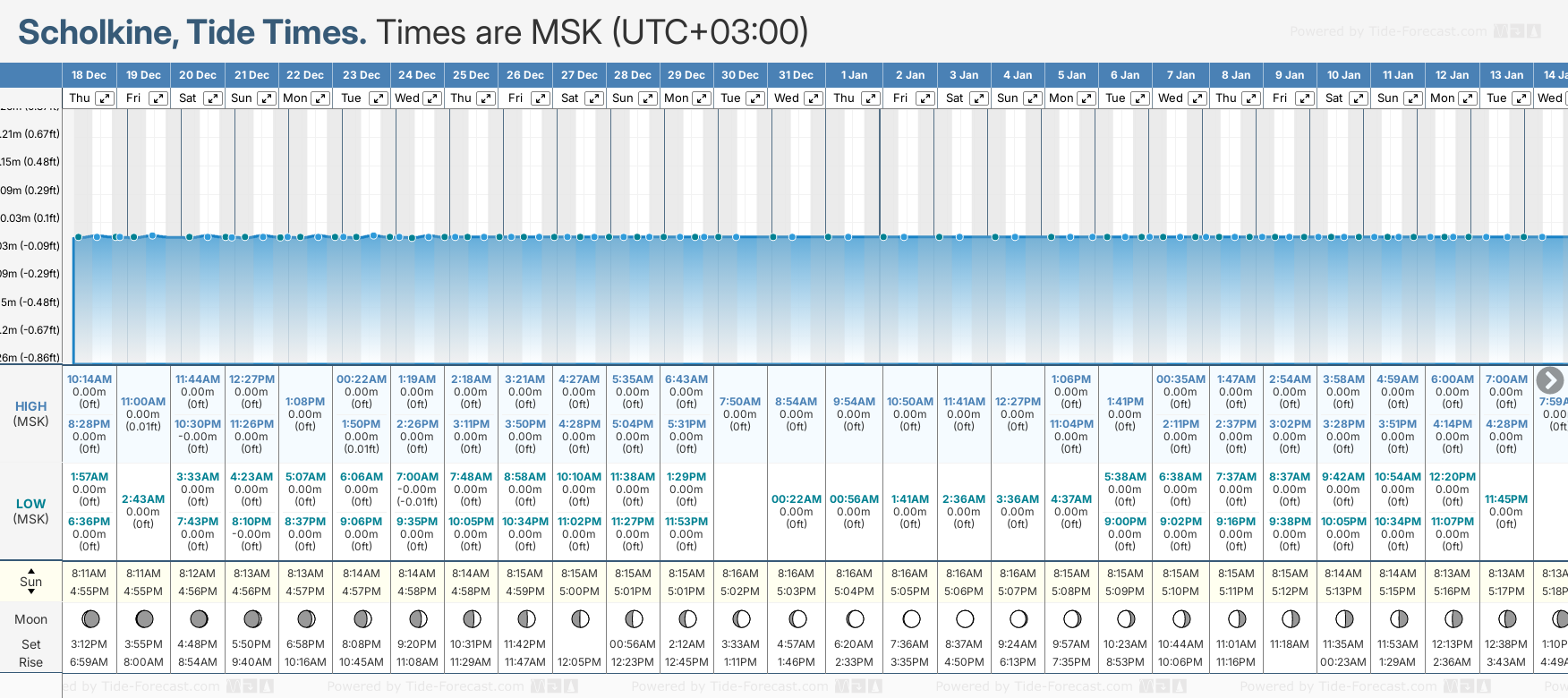 Tide Times are MSK (UTC +3.0hrs). Last Spring High Tide at Scholkine was on Tue 16 Dec (height: 0.00m 0.0ft). Next high Spring Tide at Scholkine will be on Tue 23 Dec (height: -0.00m -0.0ft).