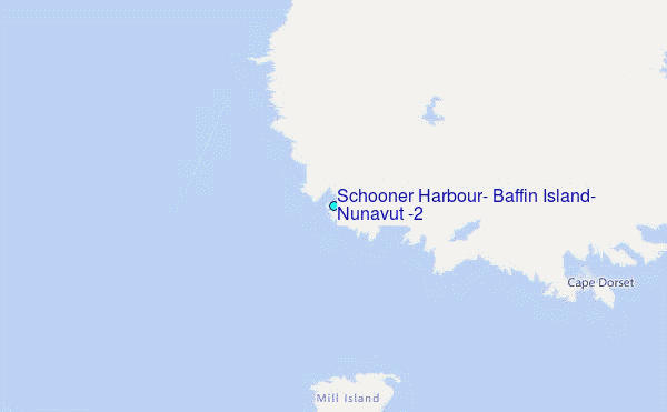 Use this relief map to navigate to tide stations, surf breaks and cities that are in the area of Schooner Harbour, Baffin Island, Nunavut (2).