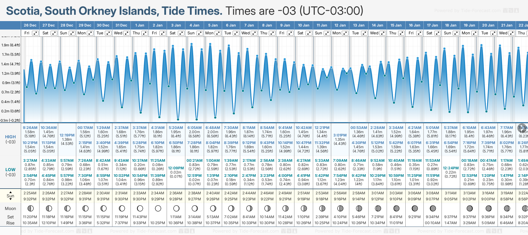 December and January Tide charts for Scotia, South Orkney Islands: The tide charts below show the height, time and date of high and low tides for the next 30 days.