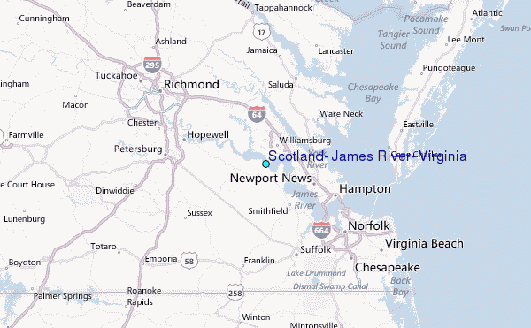 Use this relief map to navigate to tide stations, surf breaks and cities that are in the area of Scotland, James River, Virginia.