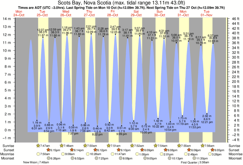 Scots Bay tide chart key: The tide chart above shows the height and times of high tide and low tide for Scots Bay, Nova Scotia. The grey shading corresponds to nighttime hours between sunset and sunrise at Scots Bay.