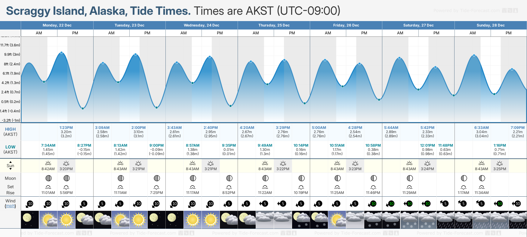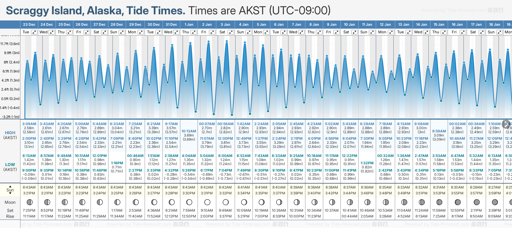Tide Times are AKST (UTC -9.0hrs). Last Spring High Tide at Scraggy Island was on Sat 20 Dec (height: 3.30m 10.8ft). Next high Spring Tide at Scraggy Island will be on Sat 03 Jan (height: 3.81m 12.5ft).