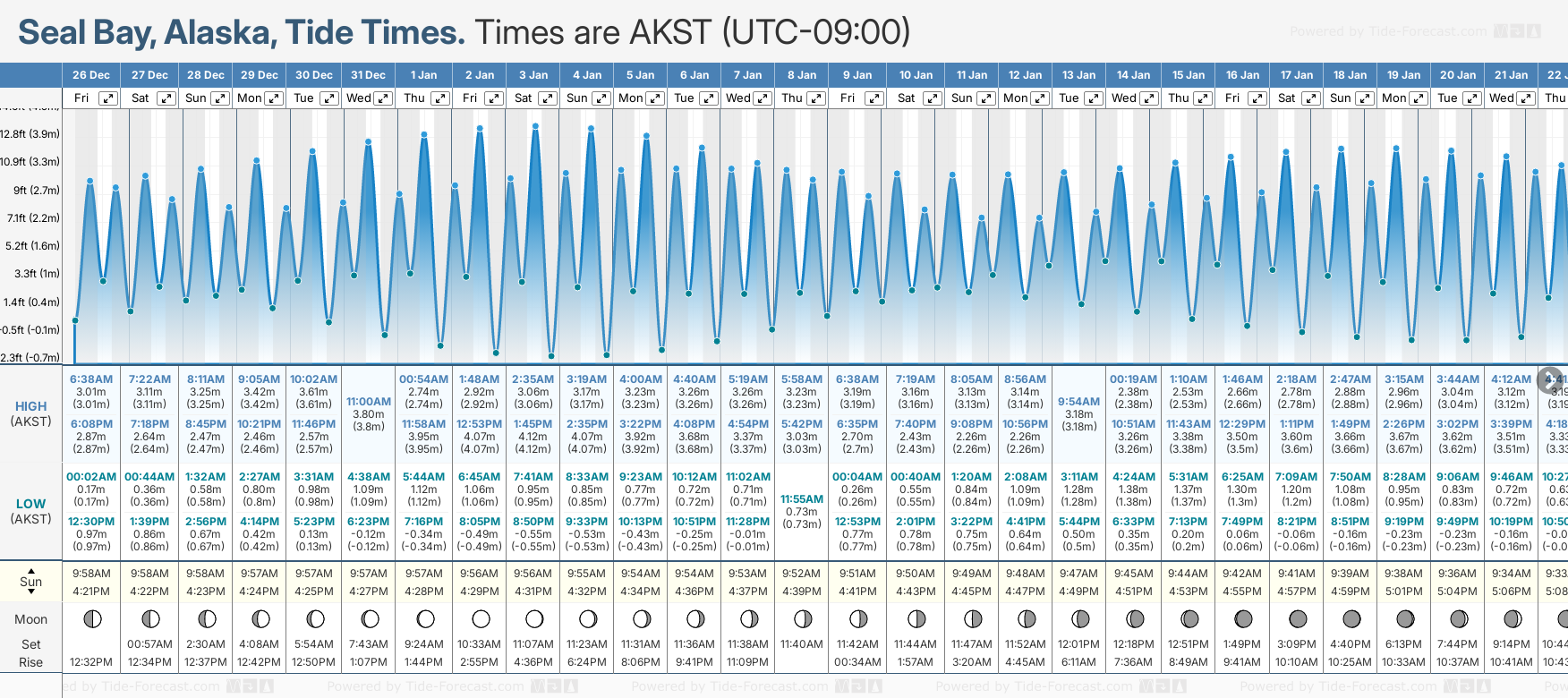 Tide Times are AKST (UTC -9.0hrs). Last Spring High Tide at Seal Bay was on Sat 20 Dec (height: 3.68m 12.1ft). Next high Spring Tide at Seal Bay will be on Sat 03 Jan (height: 4.12m 13.5ft).