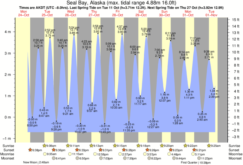 Tide Times are AKST (UTC -9.0hrs). Last Spring High Tide at Seal Bay was on Fri 05 Dec (height: 4.24m 13.9ft). Next high Spring Tide at Seal Bay will be on Sat 03 Jan (height: 4.12m 13.5ft).