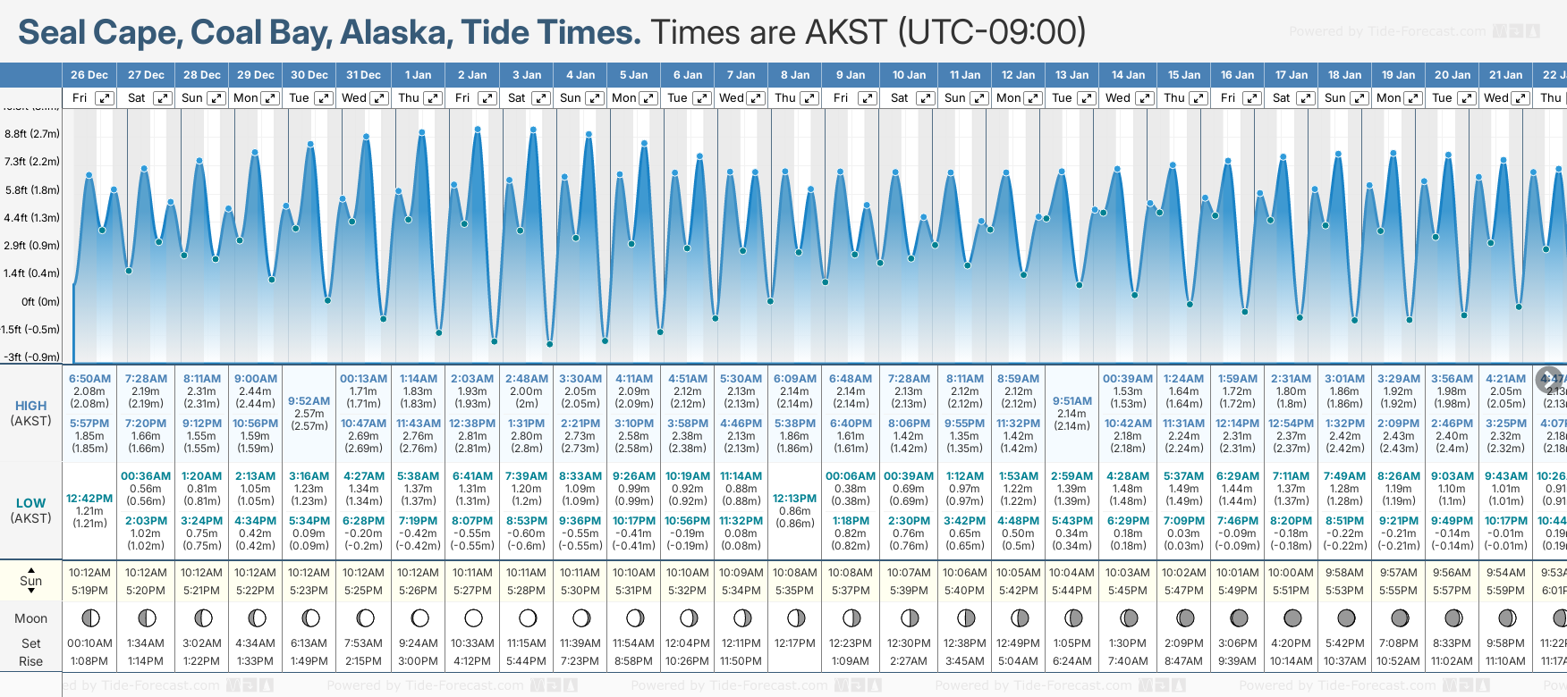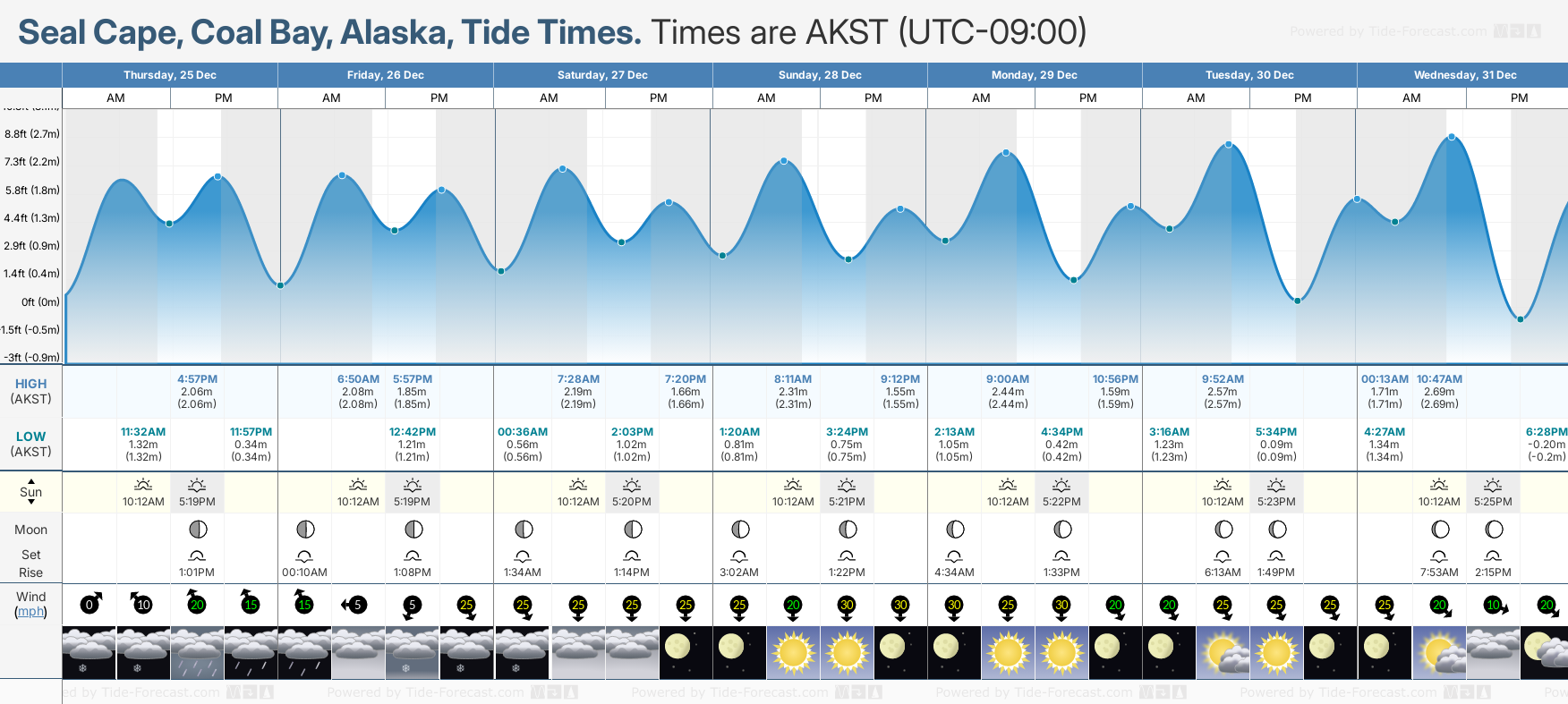 Tide Times are AKST (UTC -9.0hrs). Last Spring High Tide at Seal Cape, Coal Bay was on Sat 20 Dec (height: 2.50m 8.2ft). Next high Spring Tide at Seal Cape, Coal Bay will be on Fri 02 Jan (height: 2.81m 9.2ft).