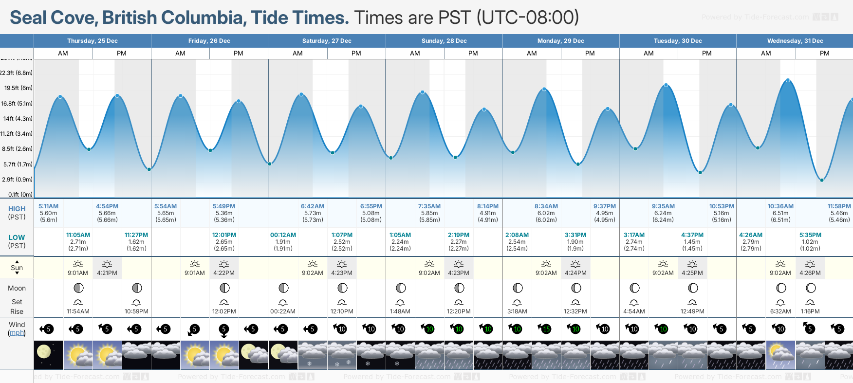 Tide Times are PST (UTC -8.0hrs). Last Spring High Tide at Seal Cove was on Sun 21 Dec (height: 6.29m 20.6ft). Next high Spring Tide at Seal Cove will be on Sat 03 Jan (height: 7.10m 23.3ft).
