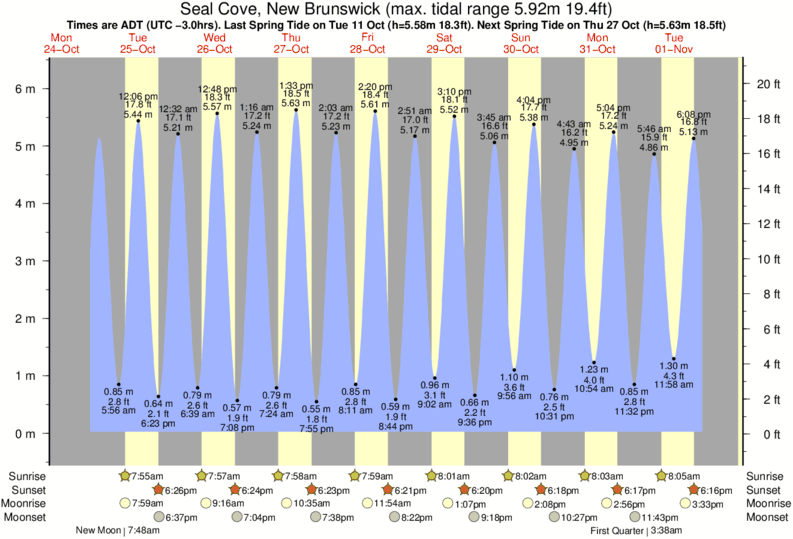 Seal Cove tide chart key: The tide chart above shows the height and times of high tide and low tide for Seal Cove, New Brunswick. The grey shading corresponds to nighttime hours between sunset and sunrise at Seal Cove.