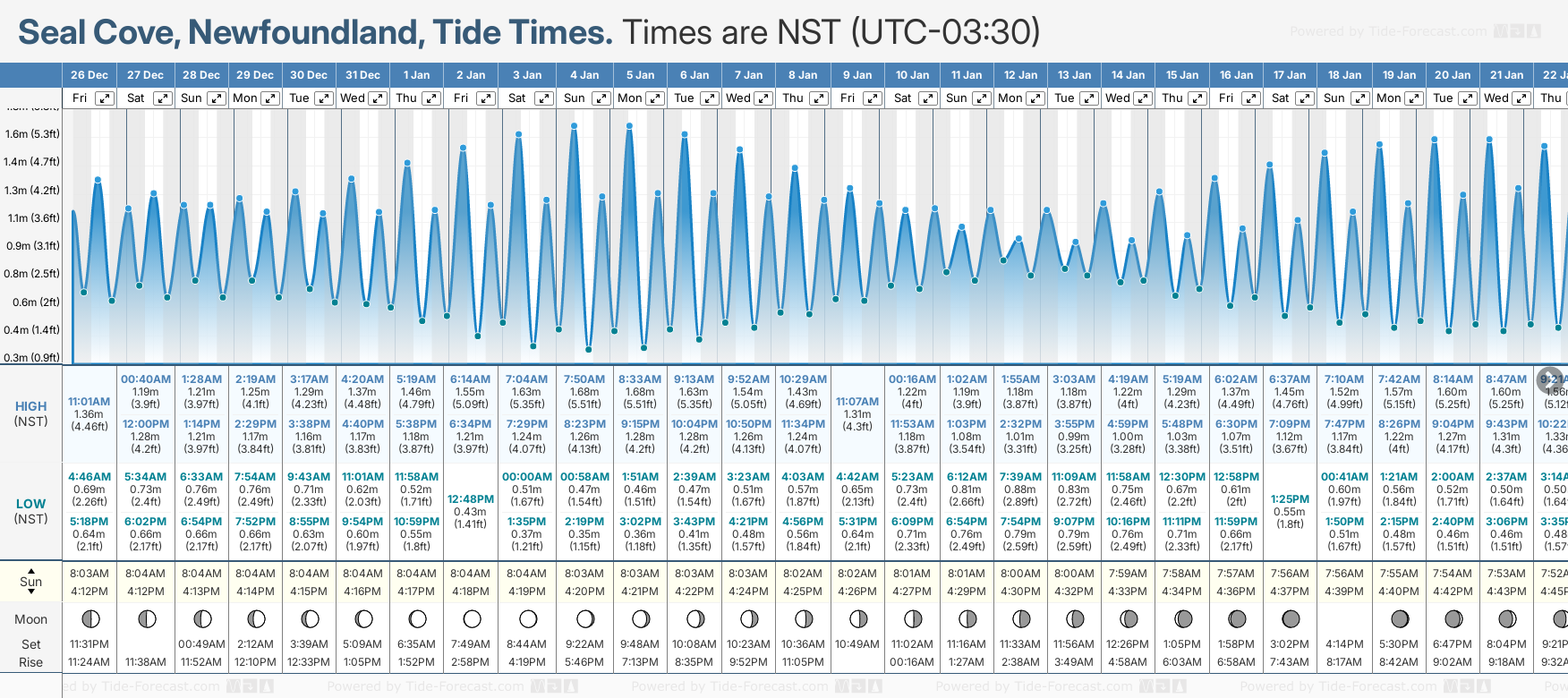 December and January Tide charts for Seal Cove: The tide charts below show the height, time and date of high and low tides for the next 30 days.