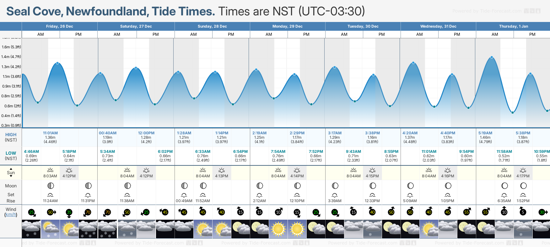 Tide chart for Seal CoveShowing low and high tide times for the next 30 days at Seal Cove. Tide Times are NST (UTC -3.5hrs).