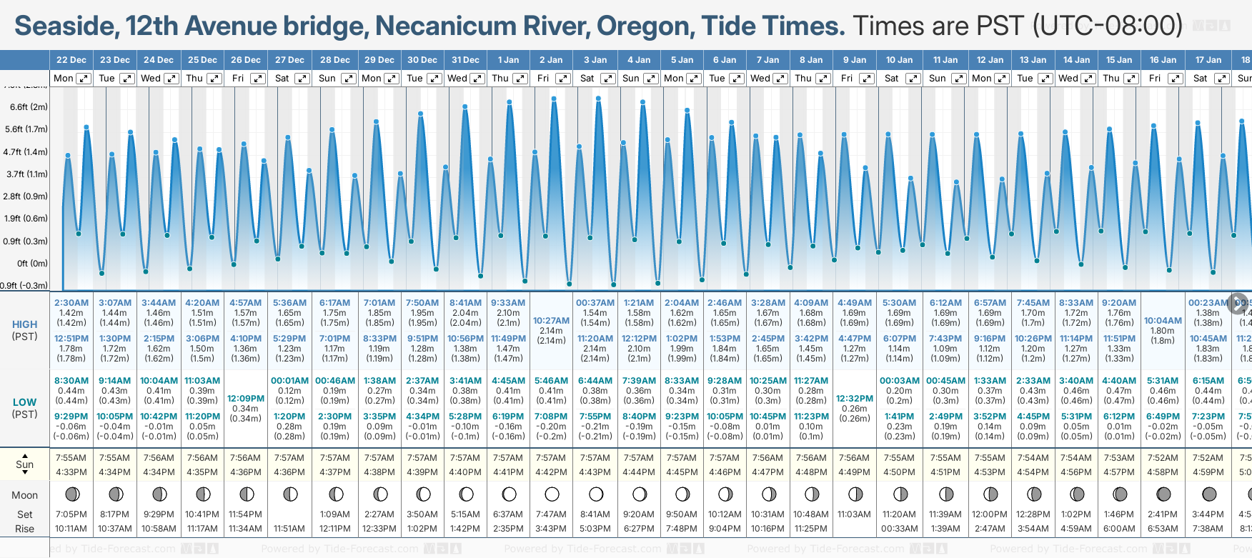 December and January Tide charts for Seaside, 12th Avenue bridge, Necanicum River: The tide charts below show the height, time and date of high and low tides for the next 30 days.