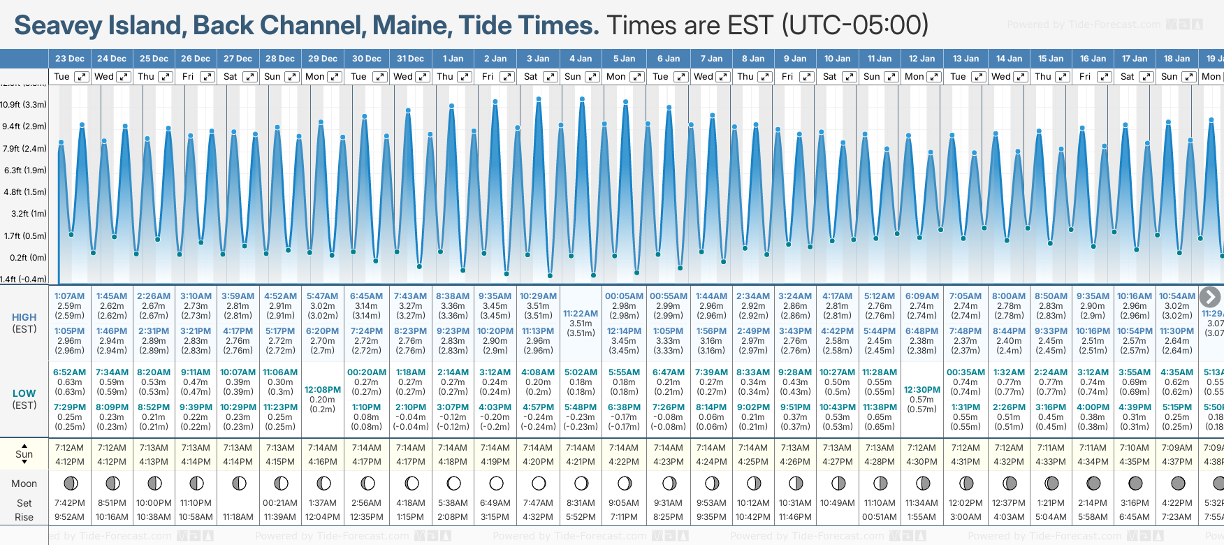Tide chart for Seavey Island, Back ChannelShowing low and high tide times for the next 30 days at Seavey Island, Back Channel. Tide Times are EST (UTC -5.0hrs).