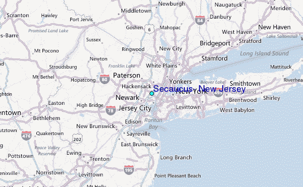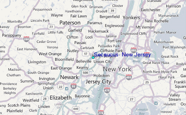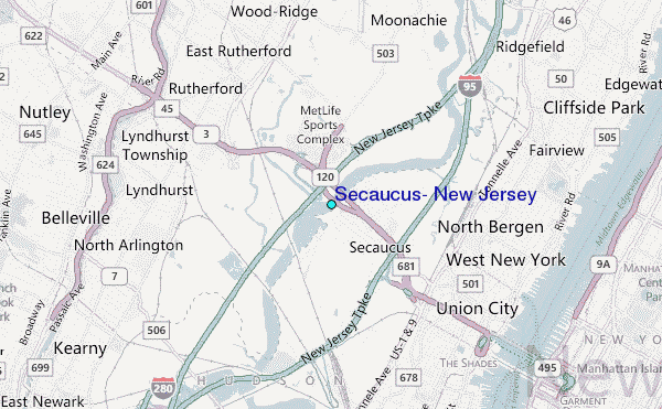 Use this relief map to navigate to tide stations, surf breaks and cities that are in the area of Secaucus, New Jersey.