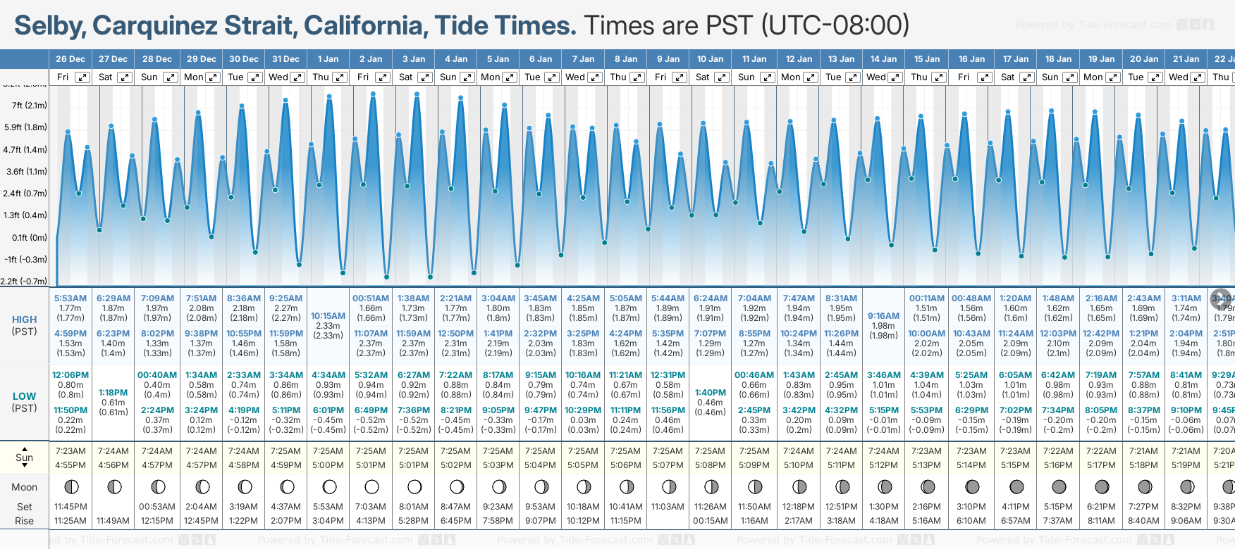 December and January Tide charts for Selby, Carquinez Strait: The tide charts below show the height, time and date of high and low tides for the next 30 days.