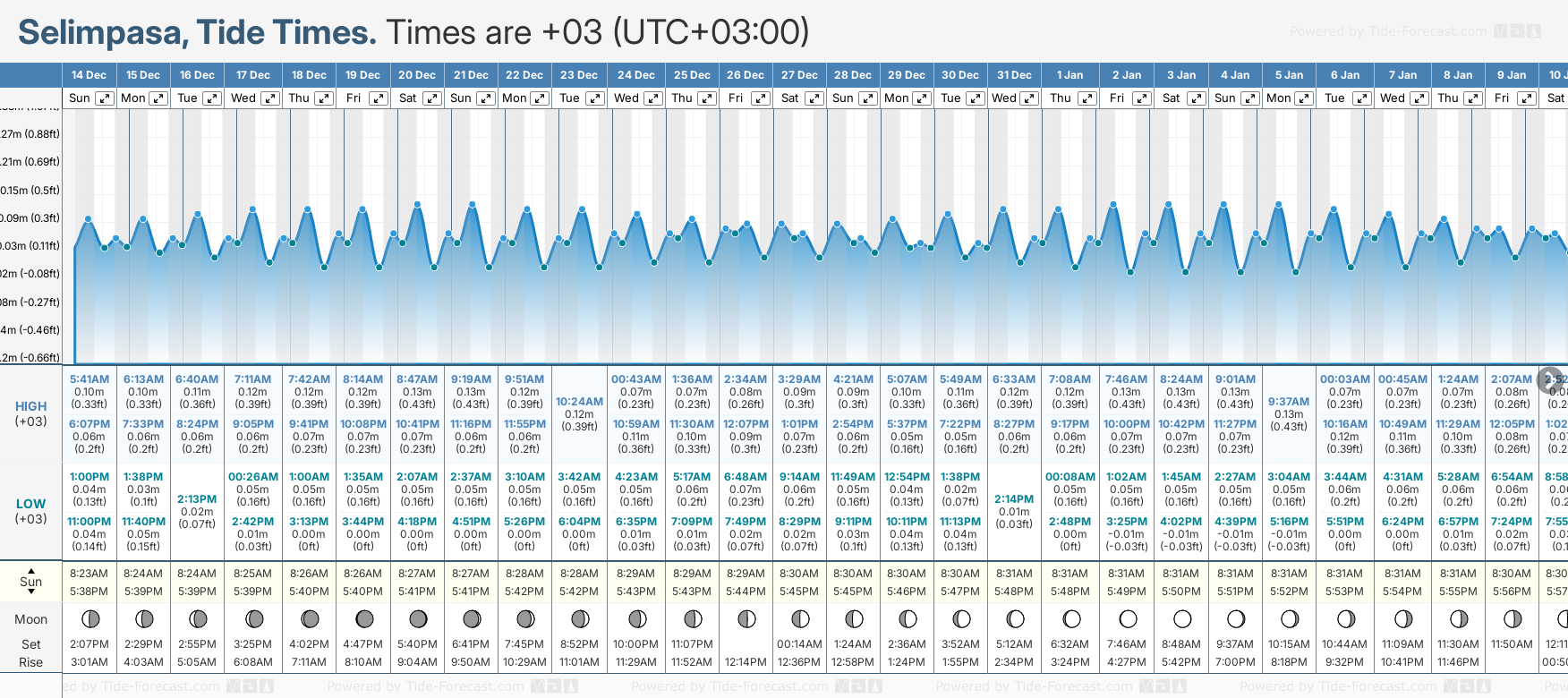 December and January Tide charts for Selimpasa: The tide charts below show the height, time and date of high and low tides for the next 30 days.