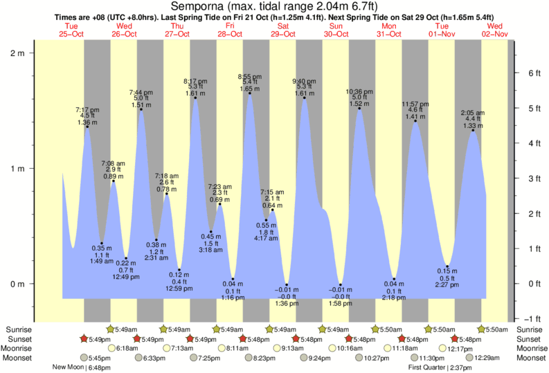Tide Times are +08 (UTC +8.0hrs). Last Spring High Tide at Semporna was on Sun 21 Dec (height: 1.56m 5.1ft). Next high Spring Tide at Semporna will be on Sun 04 Jan (height: 1.83m 6.0ft).