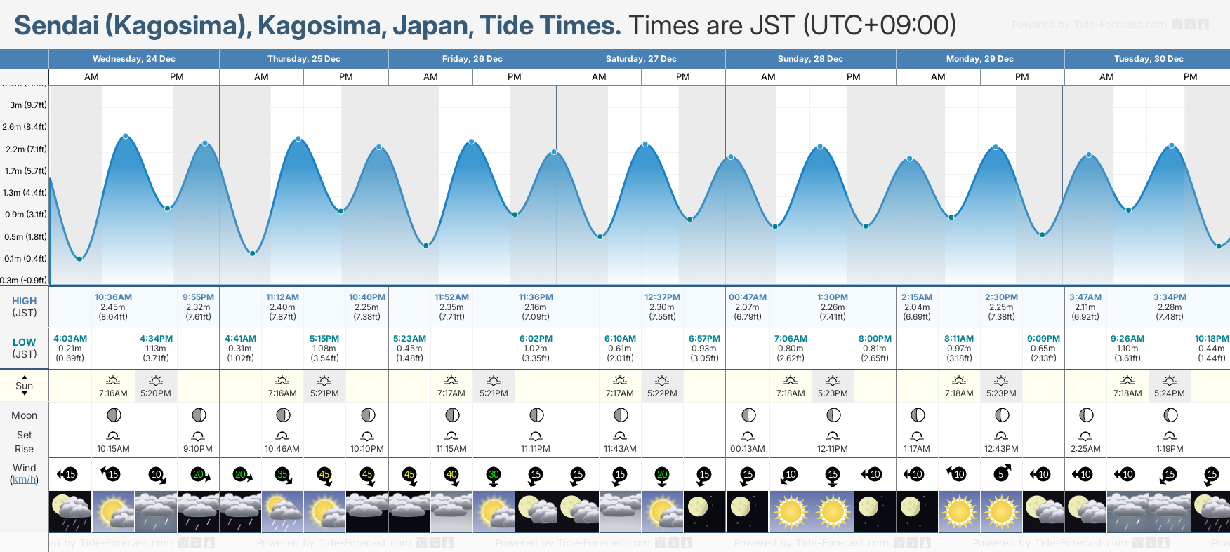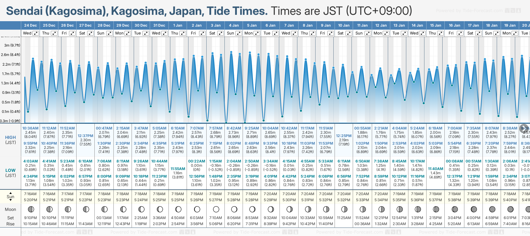 December and January Tide charts for Sendai (Kagosima): The tide charts below show the height, time and date of high and low tides for the next 30 days.