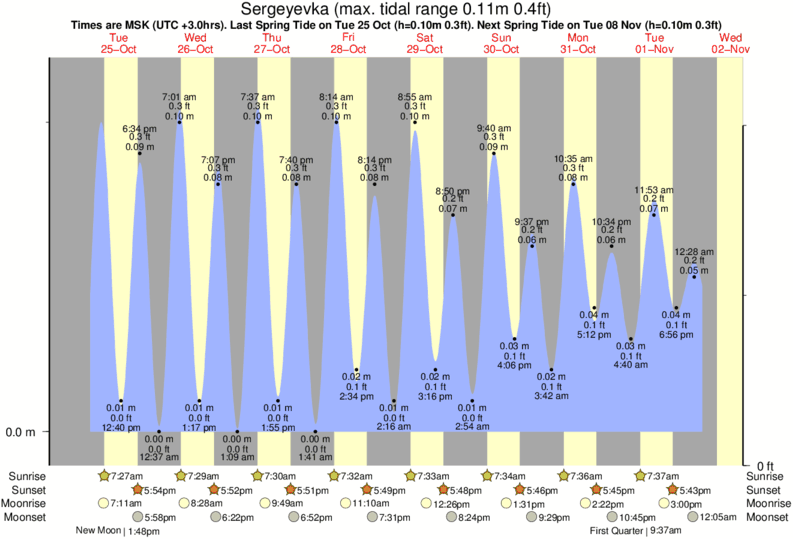 Tide Times are MSK (UTC +3.0hrs). Last Spring High Tide at Sergeyevka was on Sun 21 Dec (height: 0.10m 0.3ft). Next high Spring Tide at Sergeyevka will be on Fri 02 Jan (height: 0.10m 0.3ft).
